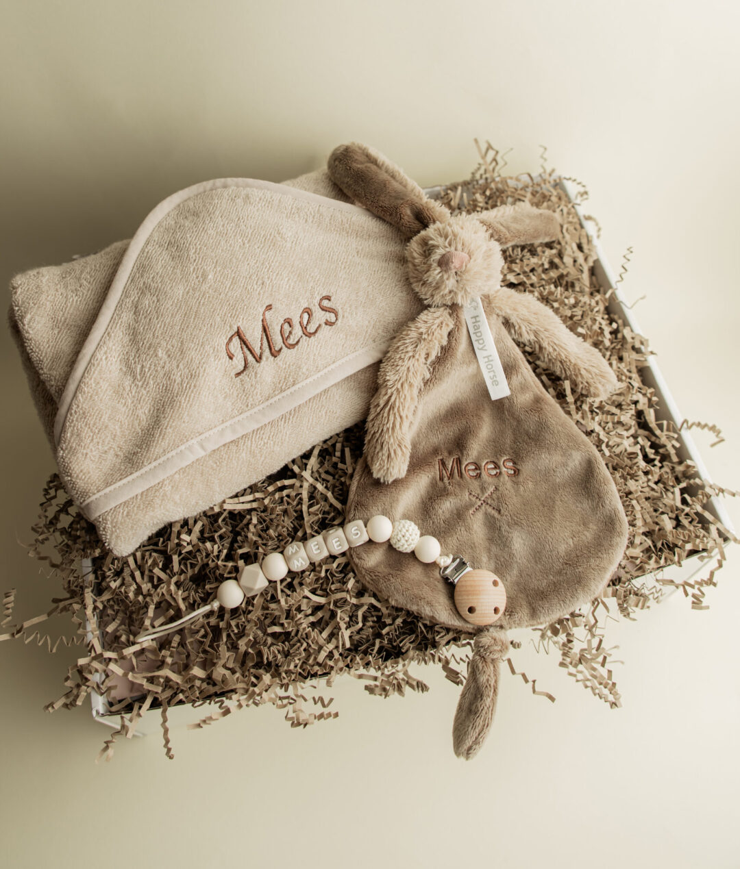 Badcape, speenkoord en knuffeldoekje met naam – speciaal voor jullie kleintje.