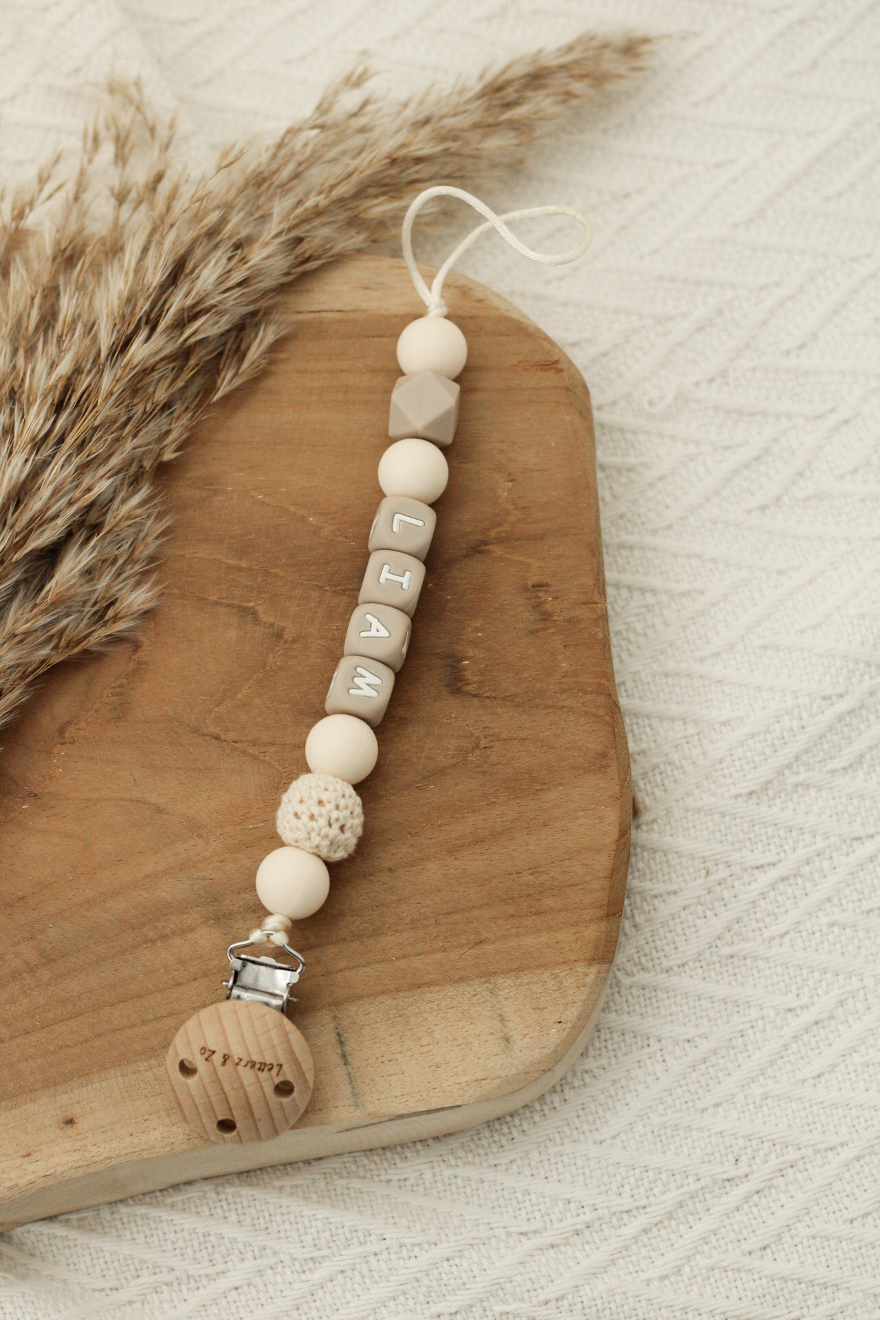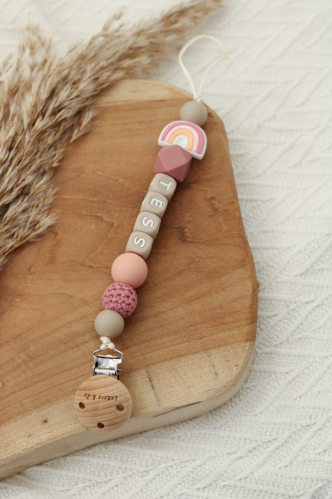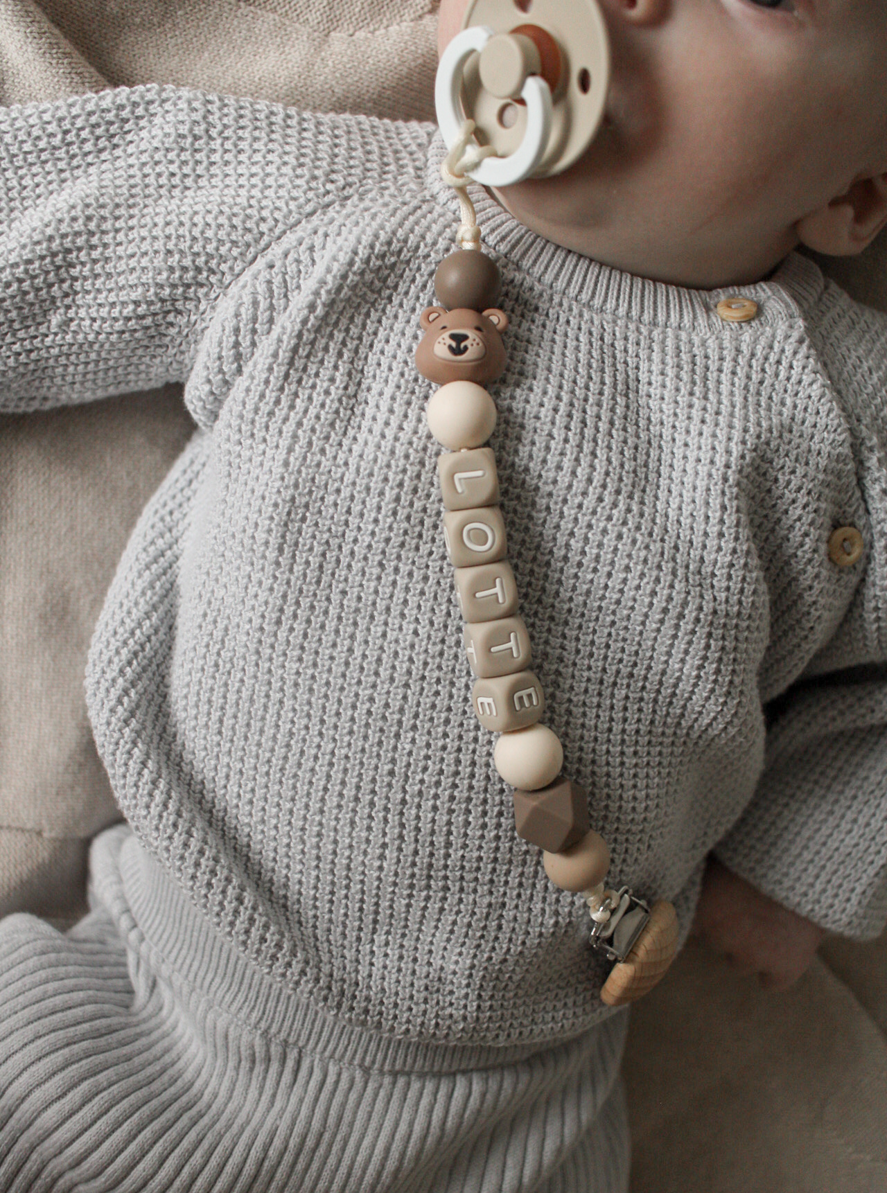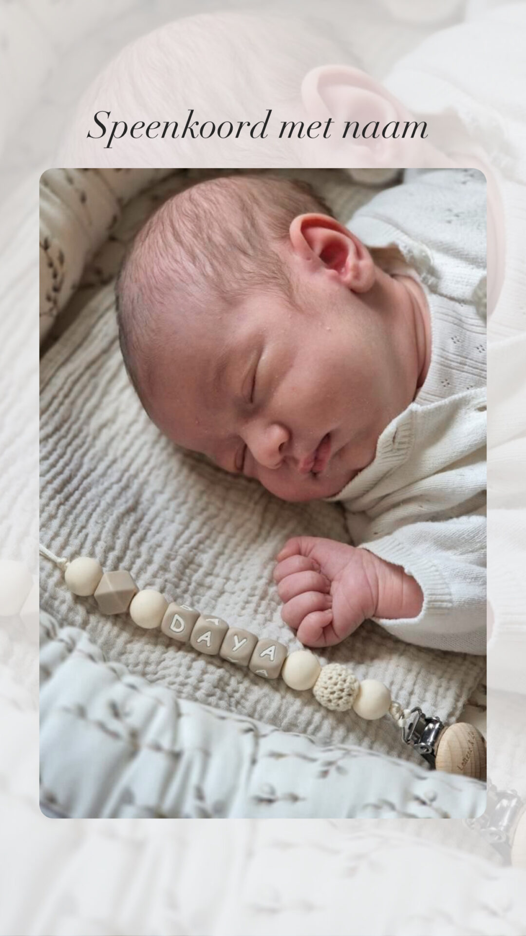 Dit speenkoord met naam is ideaal: het voorkomt dat de speen op de grond valt. Handig voor thuis én onderweg – en superleuk als kraamcadeau!