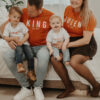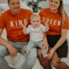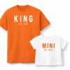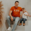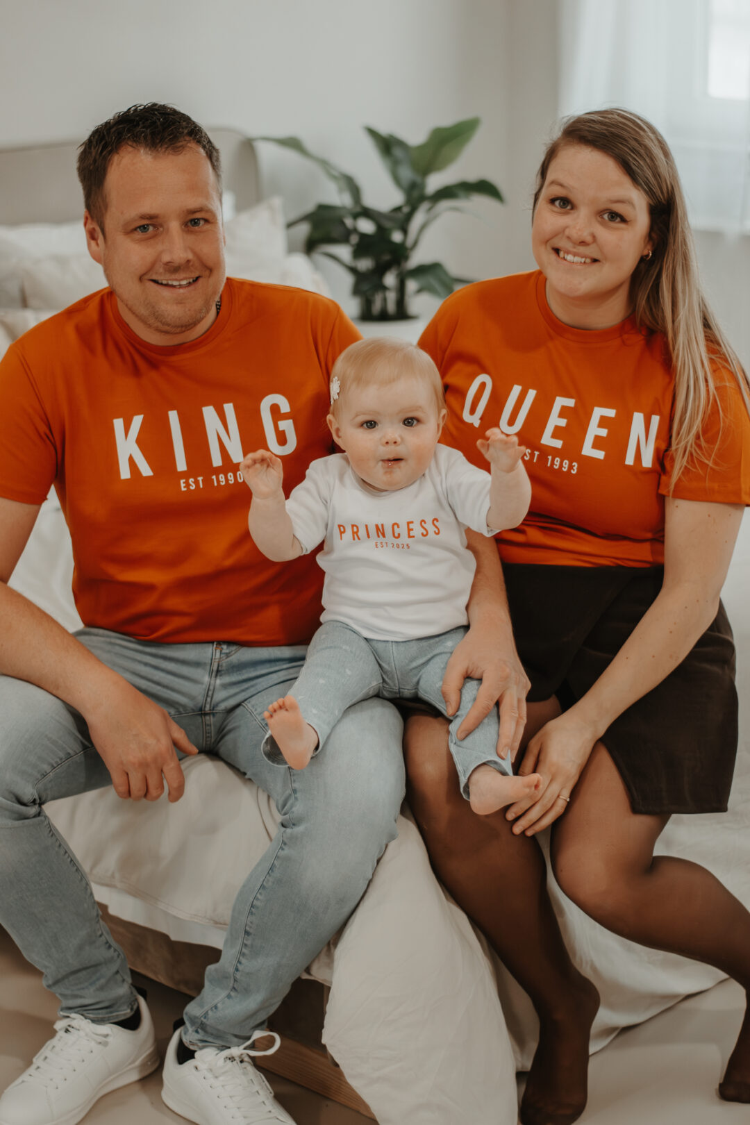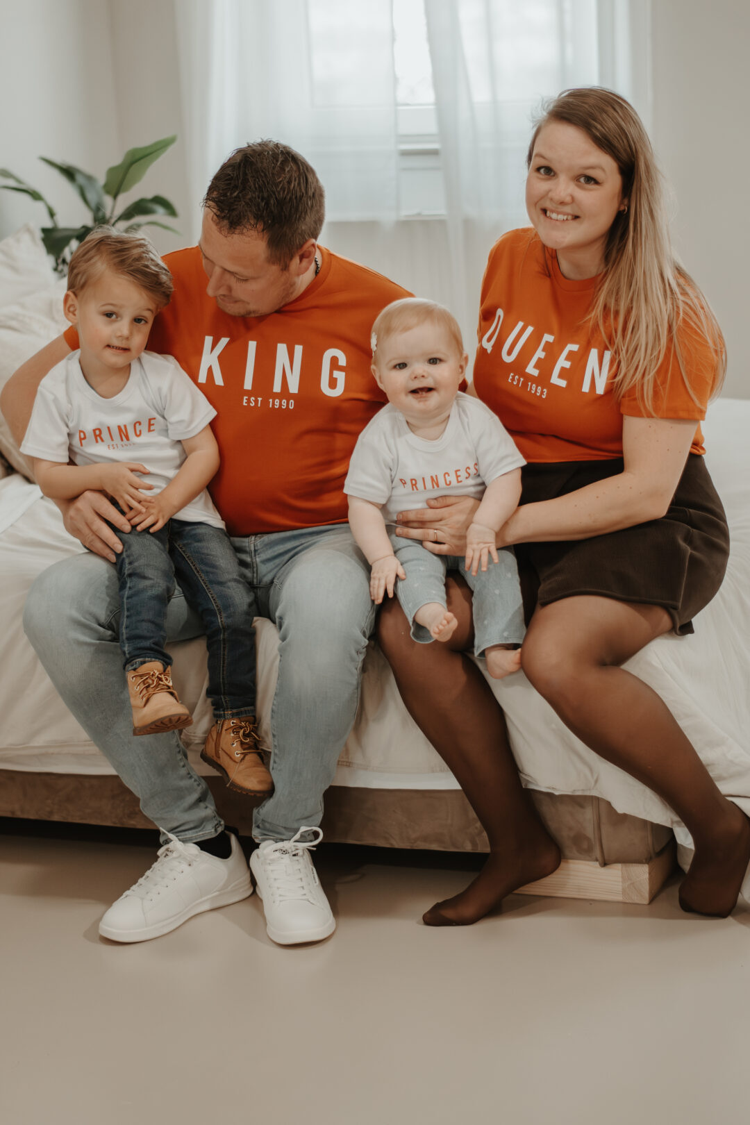 Oranje volwassen shirt met witte tekst + wit kids shirt met oranje tekst